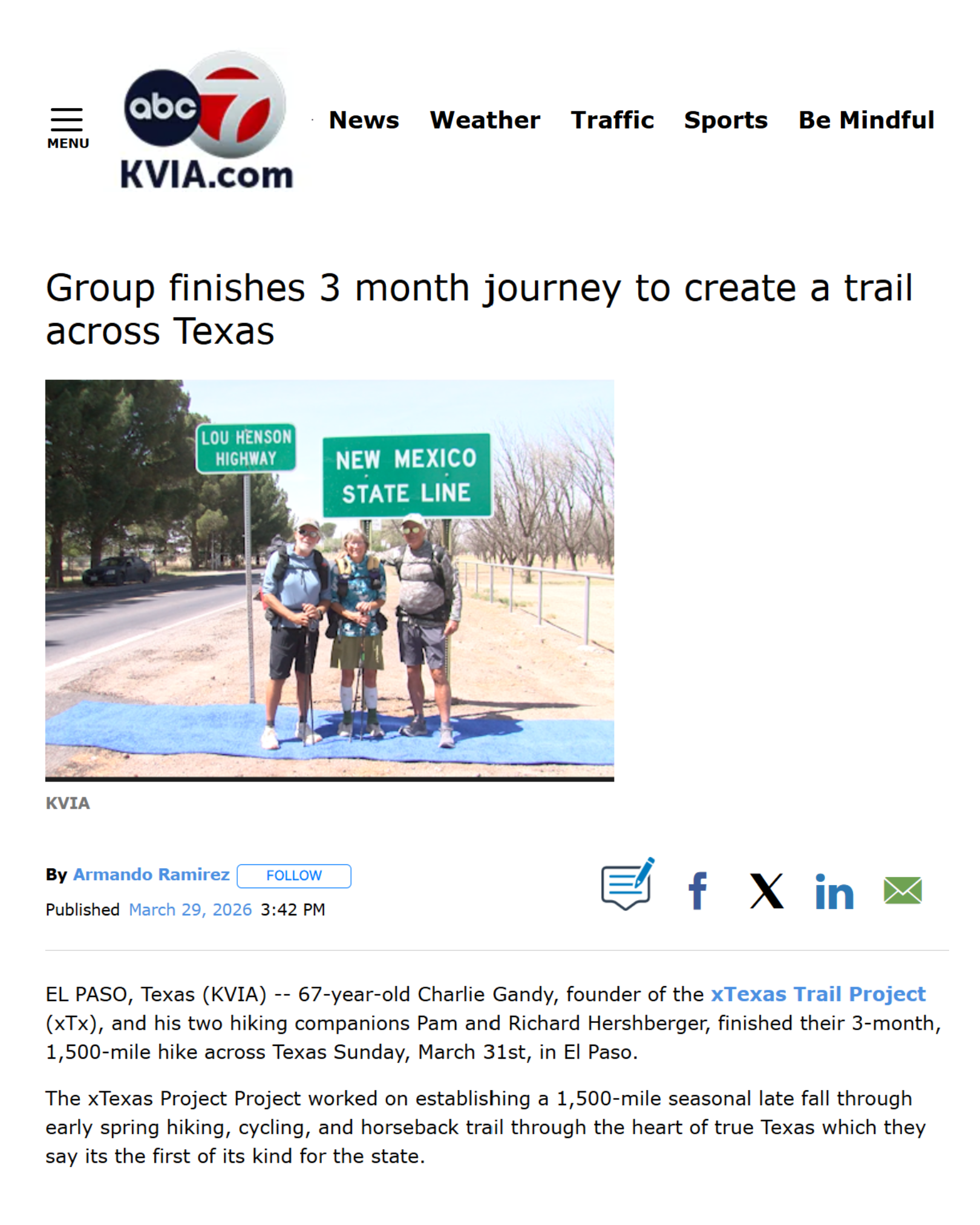 EL PASO, Texas (KVIA) -- 67-year-old Charlie Gandy, founder of the xTexas Trail Project (xTx), and his two hiking companions Pam and Richard Hershberger, finished their 3-month, 1,500-mile hike across Texas Sunday, March 31st, in El Paso.